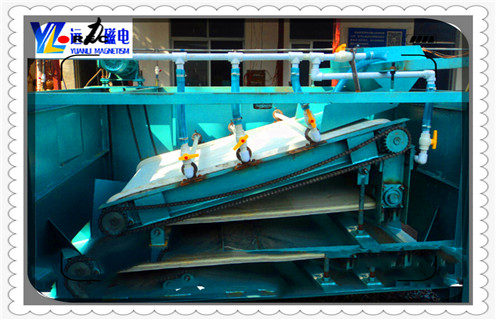2、矿粒经输送带被送入上磁辊分选,由于铁矿的矿粒有磁性,立即被强磁场吸附在磁辊上,脉石粒由于没有磁性,磁辊的强磁对它不产生吸力,随着磁辊的转动,矿粒一直被吸在磁辊上,而脉石粒在磁辊转到前端位置时被抛出掉在隔矿板的前面,矿粒继续被磁辊带到脱磁区时自动掉入一选集矿斗收集为精矿成品。